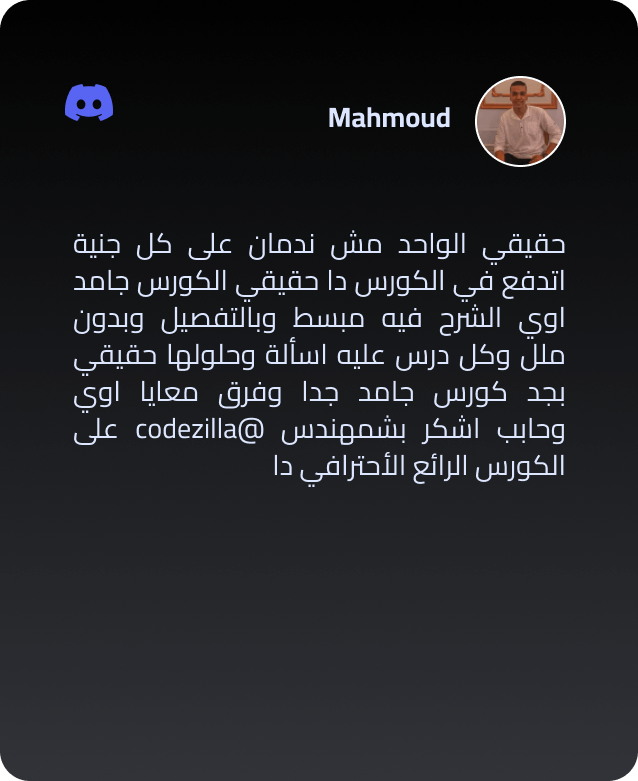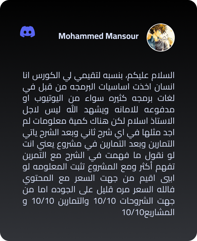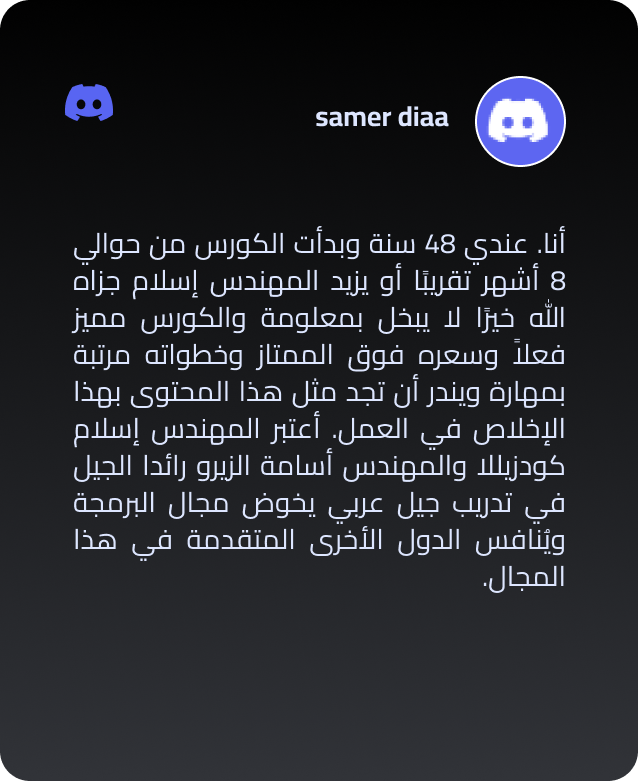 أسامة الزيرو، صاحب أكبر قناة برمجية في العالم العربي، انتج فيديو على قناته وعبر فيه عن مدى تميز الدورة بأسلوبها الفريد الذي يساعد المتعلمين على اتقان المفاهيم البرمجية بطريقة عميقة وفعّالة ويحفزهم على التطبيق العملي من خلال مشاريع عملية حقيقية