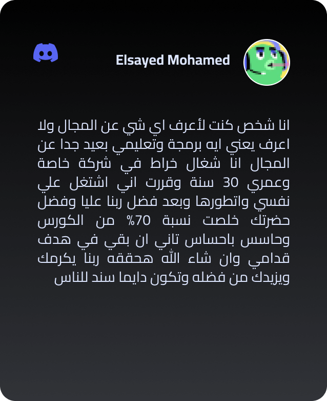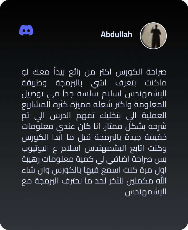 مدفوعاً بالرغبة في نقل خبراتي لخدمة العالم العربي، قمت بتصميم هذه الدورة لجعل تعلم البرمجة متاحاً للجميع بغض النظر عن خبراتهم أو معرفتهم السابقة