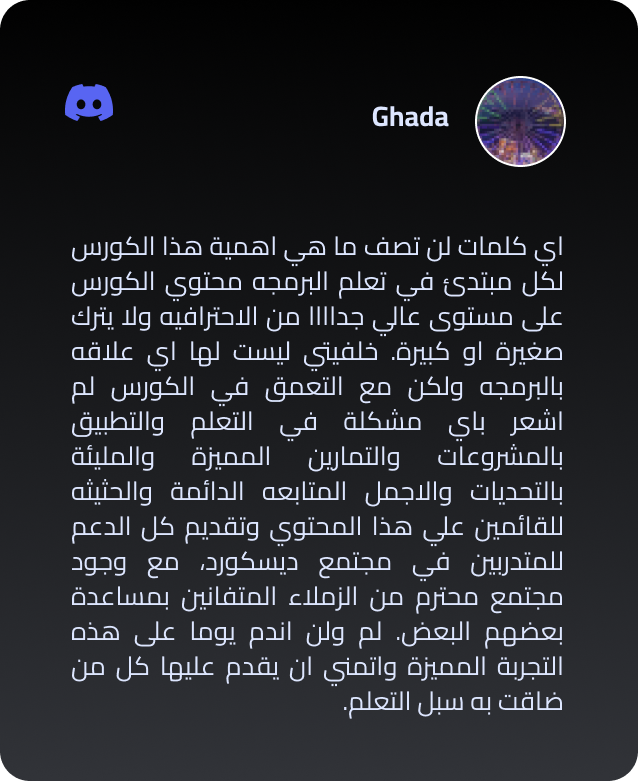 انضم إلى مجتمعنا المتفاعل واحصل على دعم مستمر من المدربين، ناقش، شارك، واستقبل ملاحظات حول مشاريعك، وحافظ على حماسك معنا