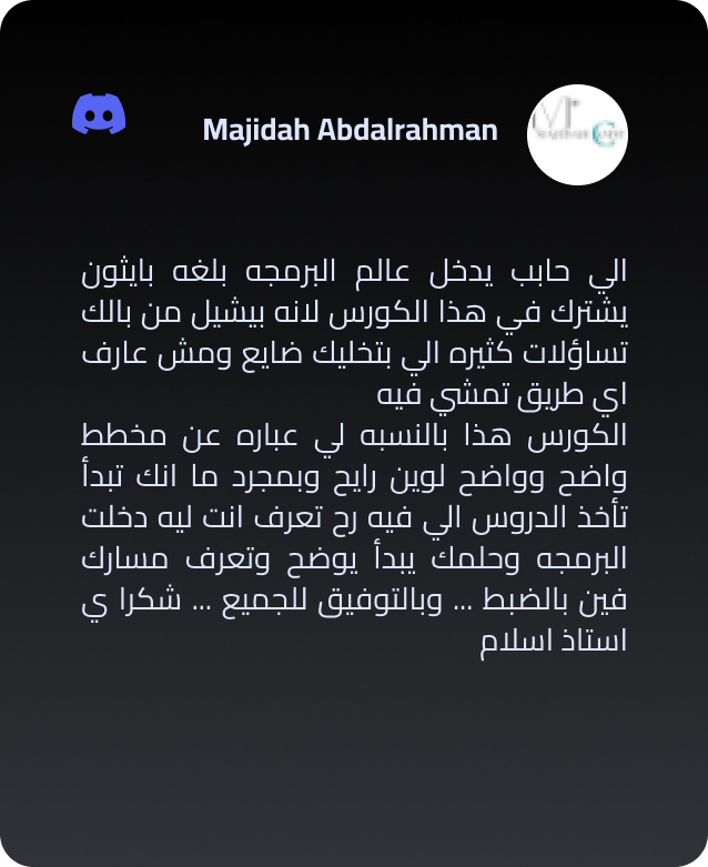تتميز دورتنا بمنهجية تعليمية استثنائية، صممت بناءً على تحليل دقيق لأرقى المناهج العالمية وباستخلاص نقاط القوة ومعالجة نقاط الضعف فيها حيث نقدم لكم تجربة شاملة تسد كل الثغرات وتضمن إتقان مفاهيم البرمجة الأساسية وتطبيقها بكفاءة من خلال الدروس التفاعلية، التمارين المكثفة، والمشاريع الواقعية و يحصل المتعلمون على دعم مستمر من مجتمعنا الخاص لتجاوز أي تحديات، ويستكشفون طيفاً واسعاً من مجالات البرمجة، مما يوفر لكم الأسس لاختيار تخصصكم بوعي وثقة، وتزويدكم بمهارات عملية قابلة للتطبيق في الحياة الواقعية، مع تقديم قيمة حقيقية تنعكس على مسيرتكم المهنية.